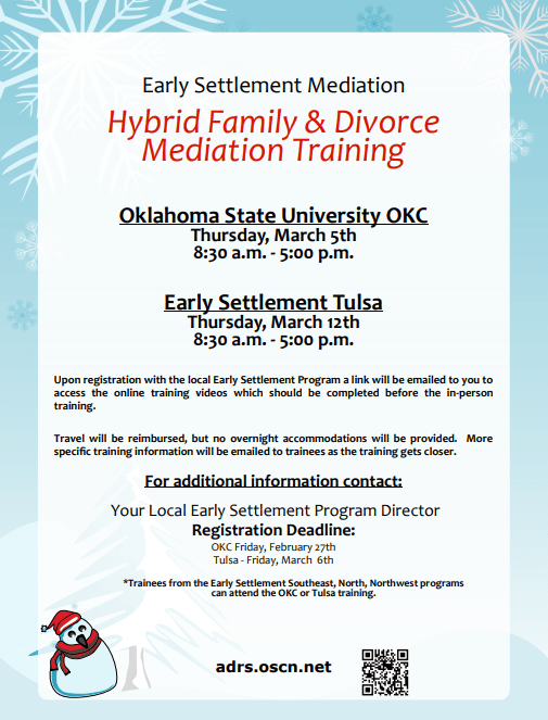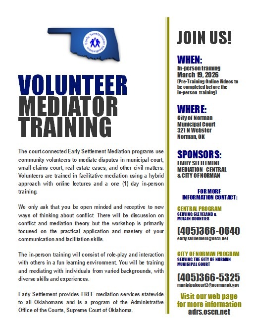 Our mission is to provide FREE, expeditious, and effective conflict resolution services to Cleveland and McClain counties in Central Oklahoma. Early Settlement Mediation utilizes community volunteers who are trained and certified through the program. Our mediators strive to help people participate in settling their own conflicts to create a more peaceful community to live and work.