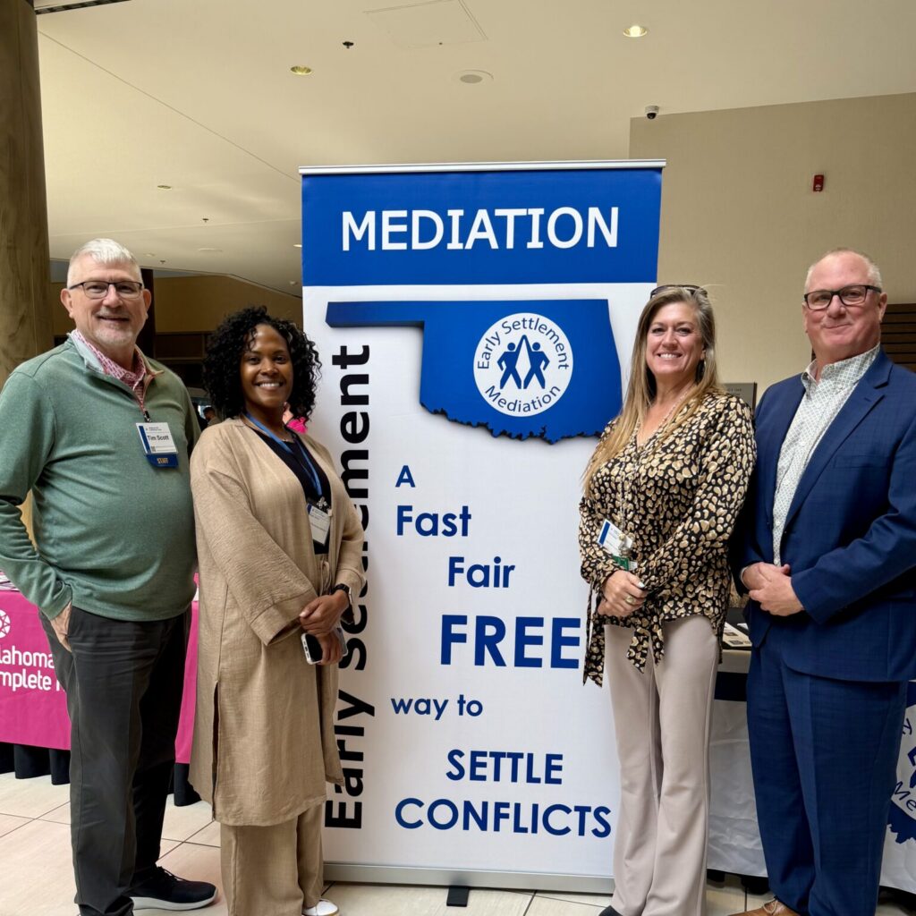 Court Improvement Conference! Directors from the Early Settlement Mediation regional programs recently staffed an information table with brochures at the Court Improvement Conference in Norman. The Early Settlement Mediation program provides FREE mediation services for child permanency cases when court ordered. Pictured l to r: Sarah Head, Southwest Program, Stacy Horner, West Program, Laruen O’Brien, Associate State Director & Oklahoma County Program, & Jorjia Cash, East Central Program. Pictured L to R: Phil Johnson, State Director, Alternative Dispute Resolution System & Jaxie Johnston, South Central Program.