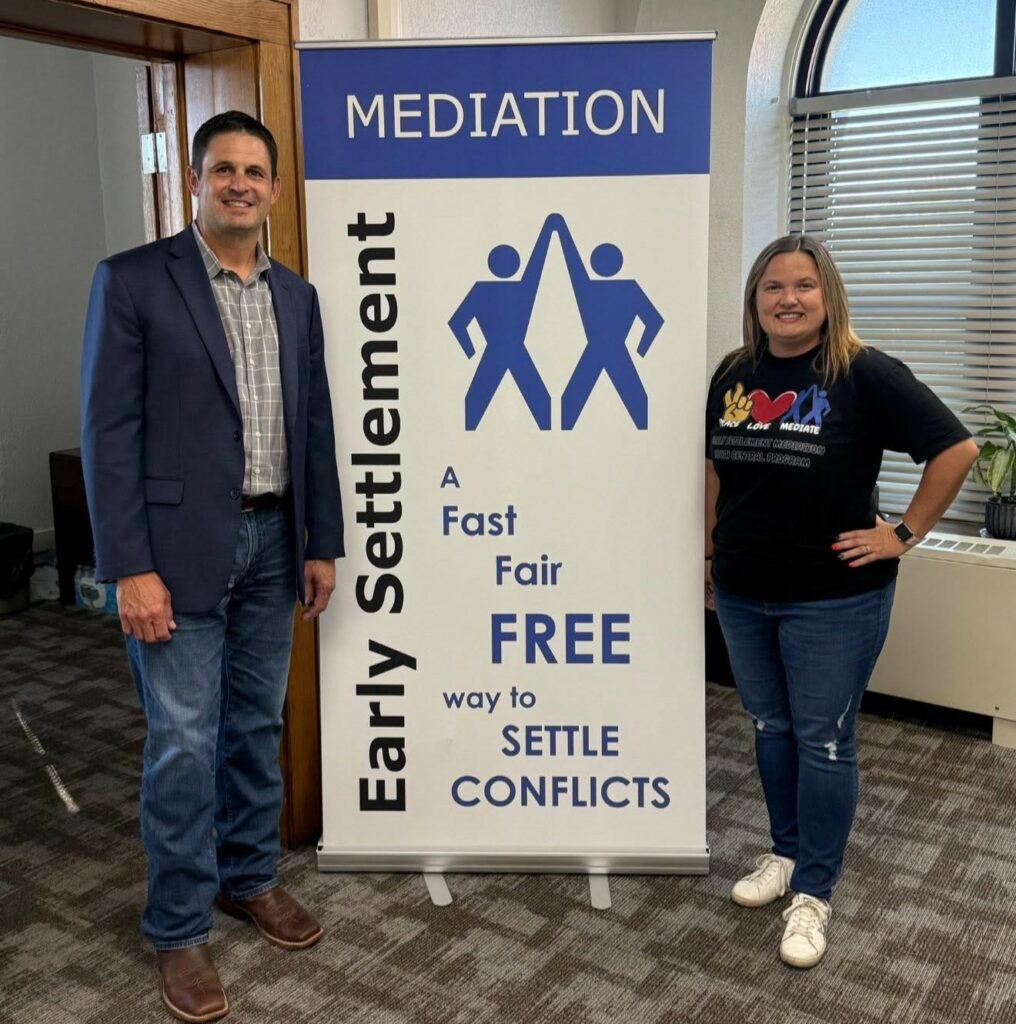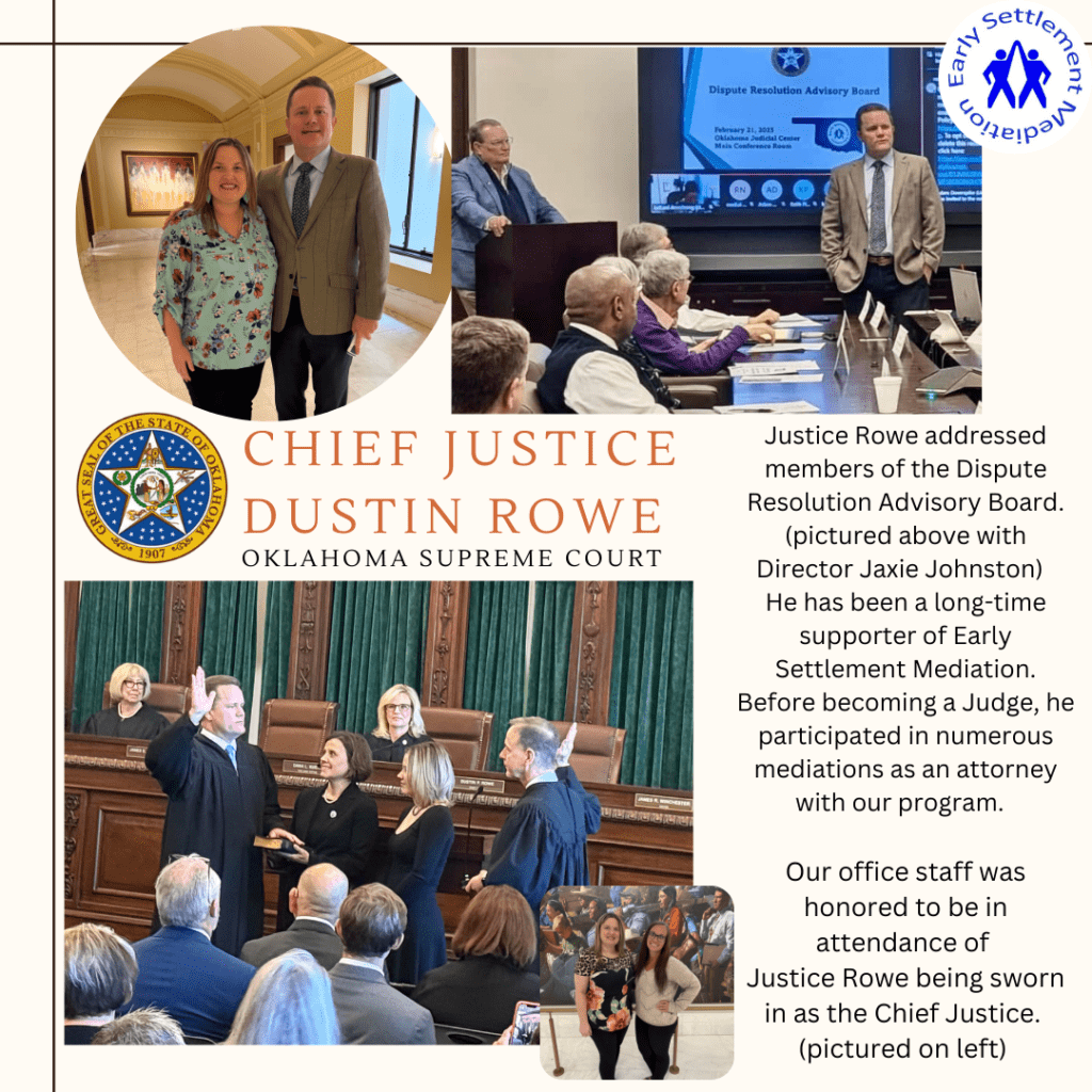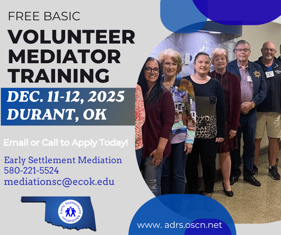 Basic Civil Mediator Training! Early Settlement Mediation is in need of new volunteer mediators in Southern Oklahoma. Our Program provides FREE mediation services for the courts and community by using trained volunteer mediators. If you are interested in becoming a volunteer mediator for the Early Settlement Program, please reach out to our office by phone or email to apply today!Court Improvement Conference! Directors from the Early Settlement Mediation regional programs recently staffed an information table with brochures at the Court Improvement Conference in Norman. The Early Settlement Mediation program provides FREE mediation services for child permanency cases when court ordered. Pictured L to R: Phil Johnson, State Director, Alternative Dispute Resolution System & Jaxie Johnston, Director, South Central Program.